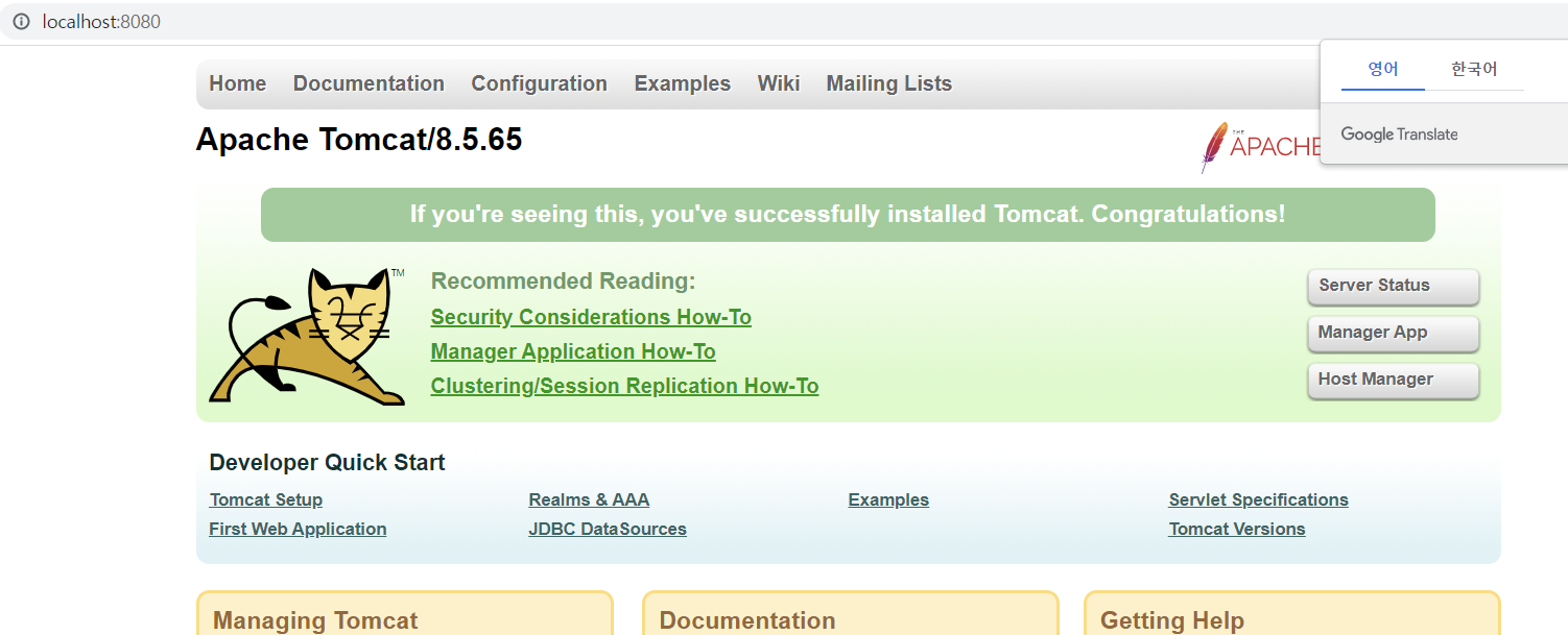 - Tomcat 설치 : apache-tomcat-8.5.65